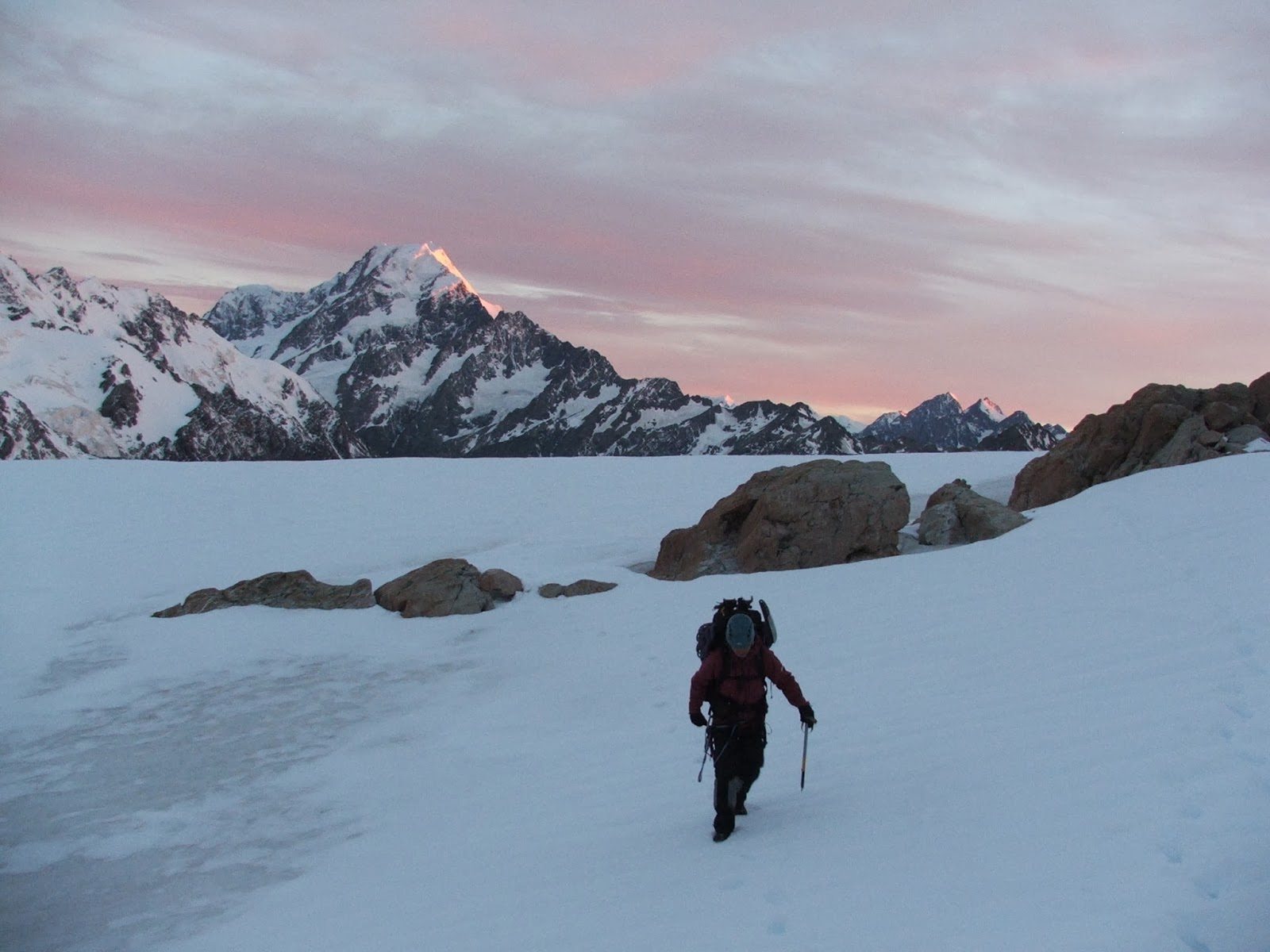 Description: A person walking up a snowy hill with a backpack on their back and a mountain in the background with a pink sky.