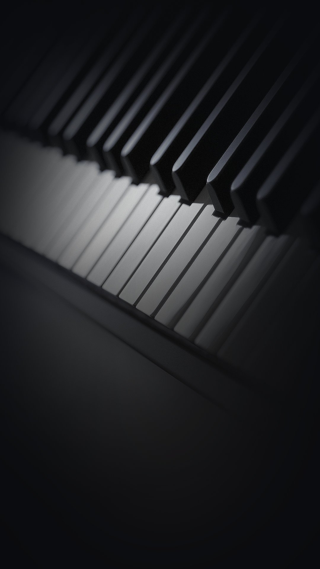Description: A piano keyboard with a black background and a light shining on it's side and the keys are black.