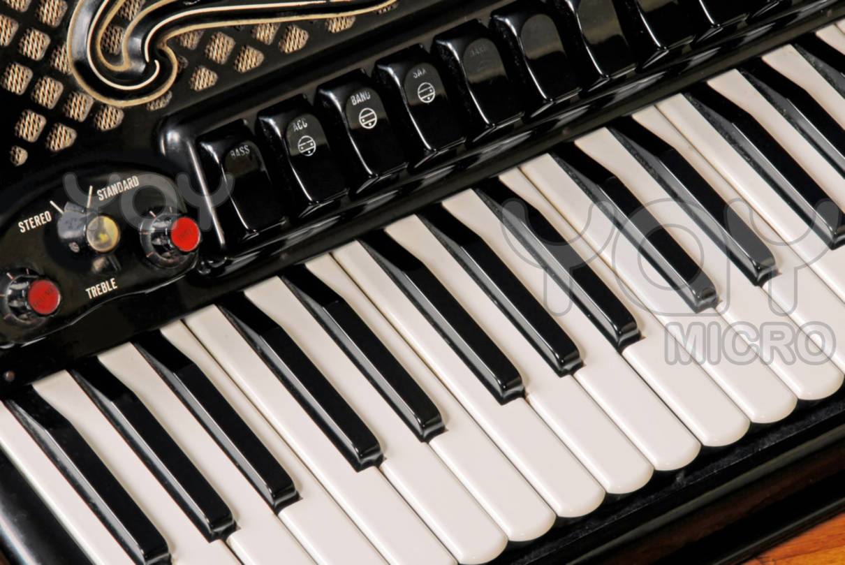 Description: A close up of a piano keyboard with many keys and knobs on it's sides and a black case with a white and black design.