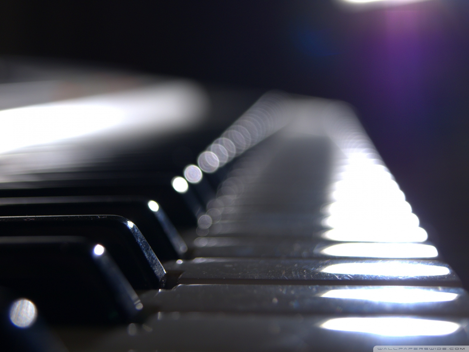 Description: A close up of a piano keyboard with light shining on it's keys and a blurry background.