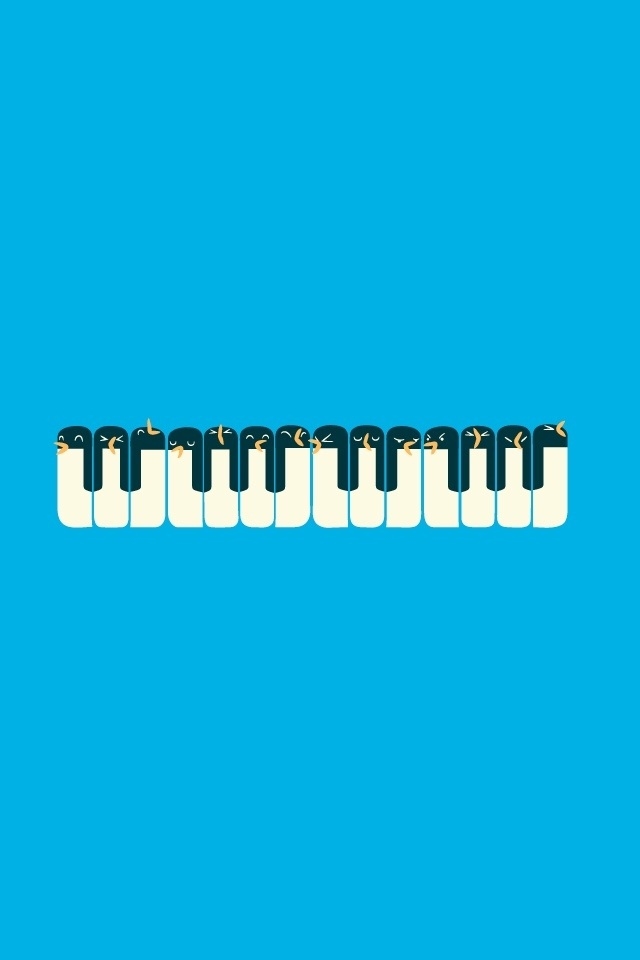 Description: A row of piano keys on a blue background with a shadow of the piano keys on the bottom row.