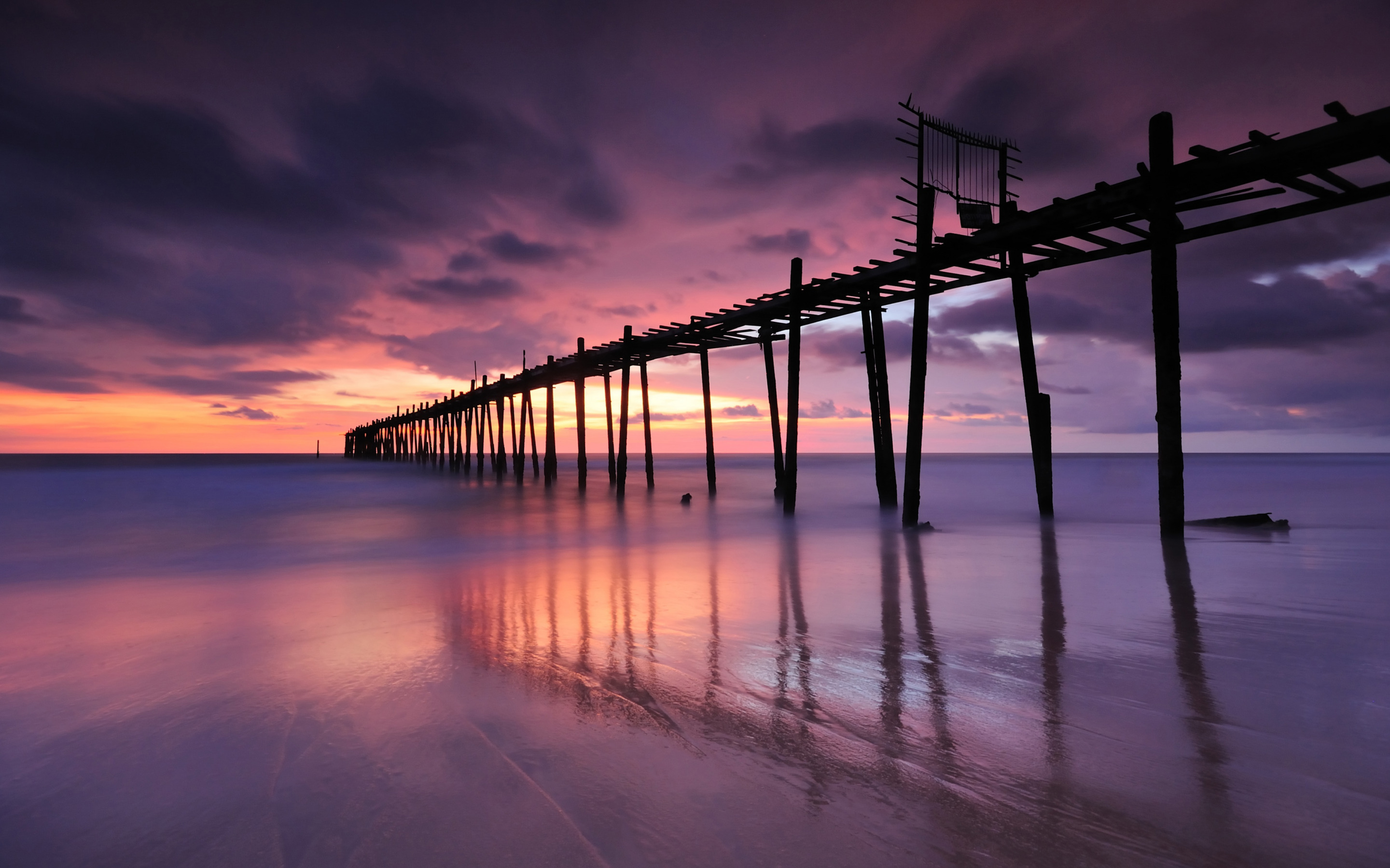 Description: A long pier sitting on top of a beach under a purple sky at sunset with clouds in the sky.