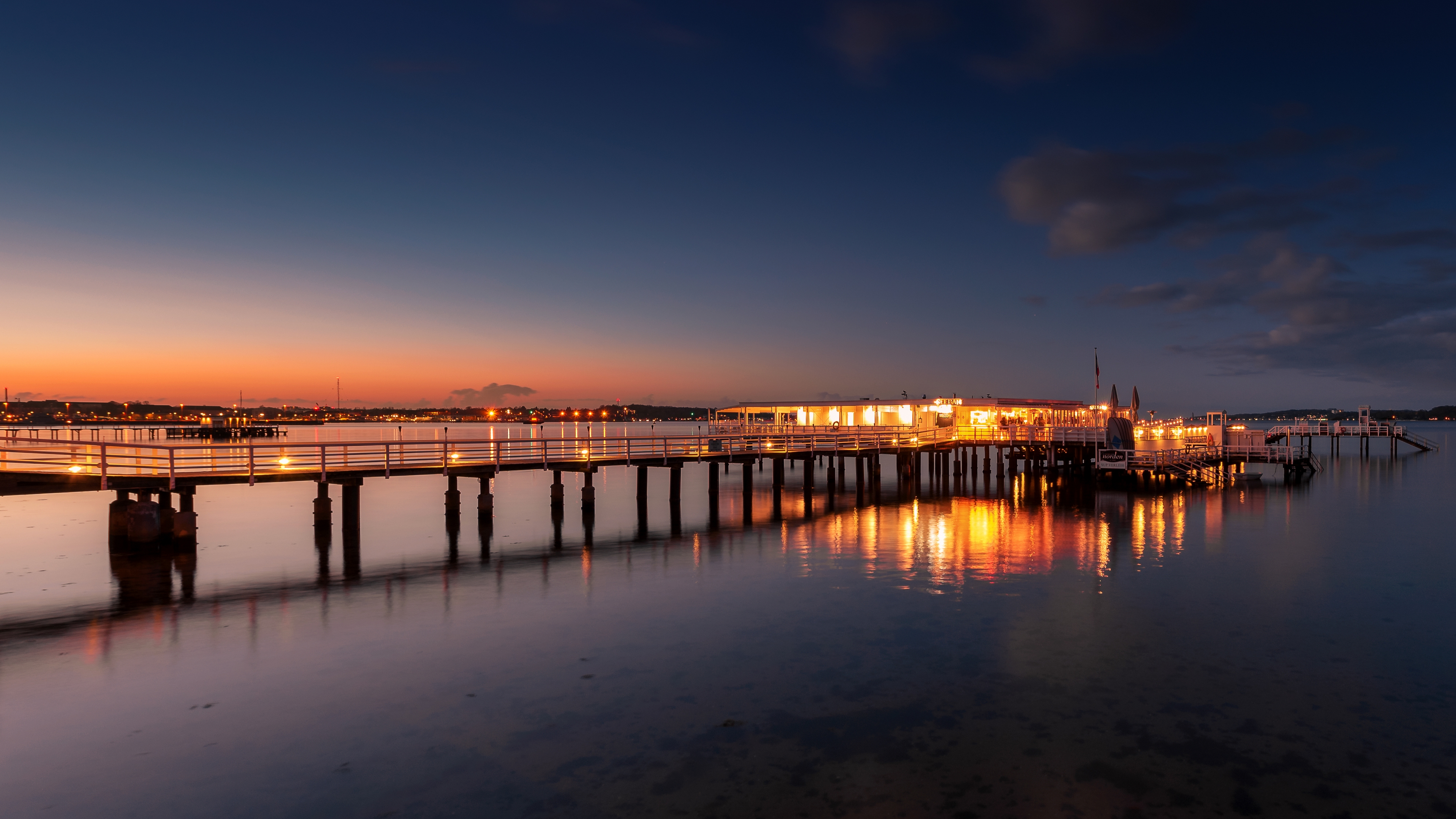 Description: A pier with a building in the background at night time with lights on it and water reflecting off the water.