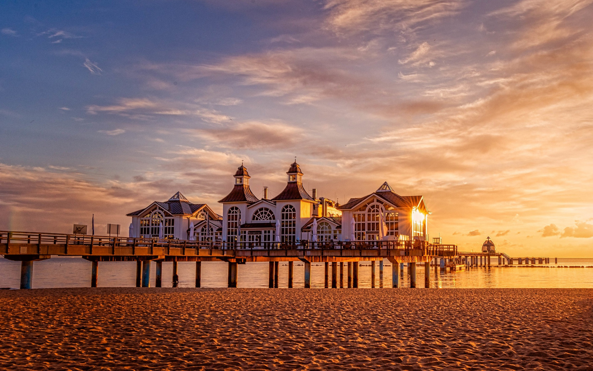 Description: A pier with a building on it at sunset or dawn with clouds in the sky above it and a body of water below.