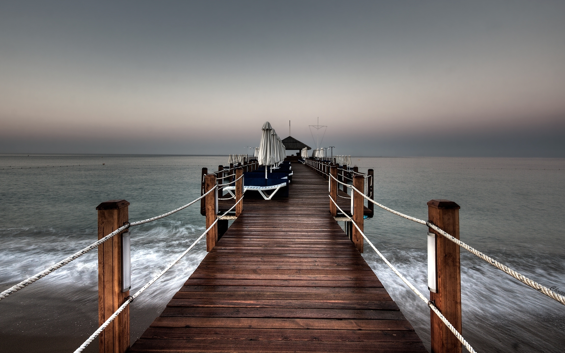 Description: A pier with chairs on it and a boat in the water behind it at dusk time with a dark sky.