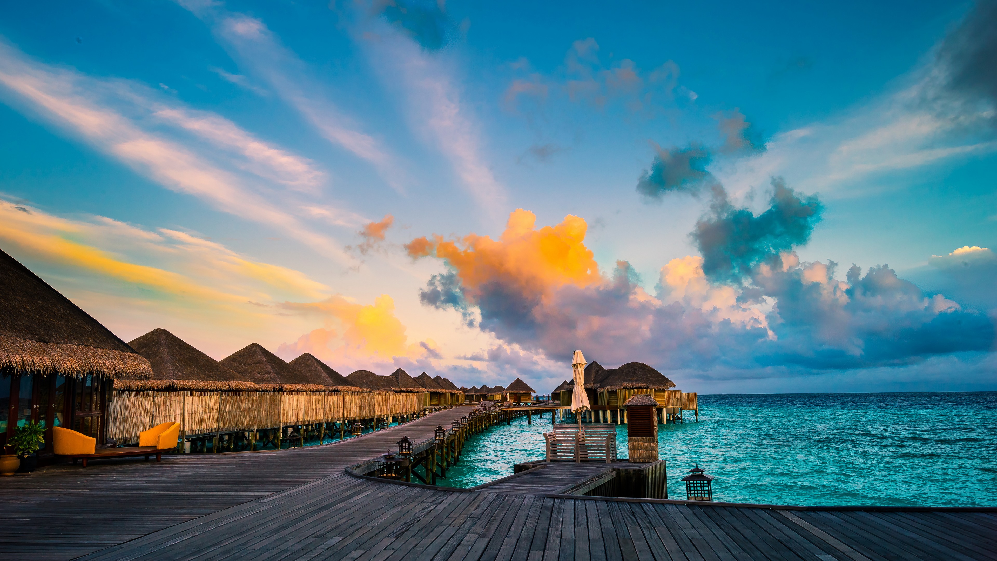 Description: A pier with a clock tower on it and a cloudy sky above it and a body of water with a dock and huts.