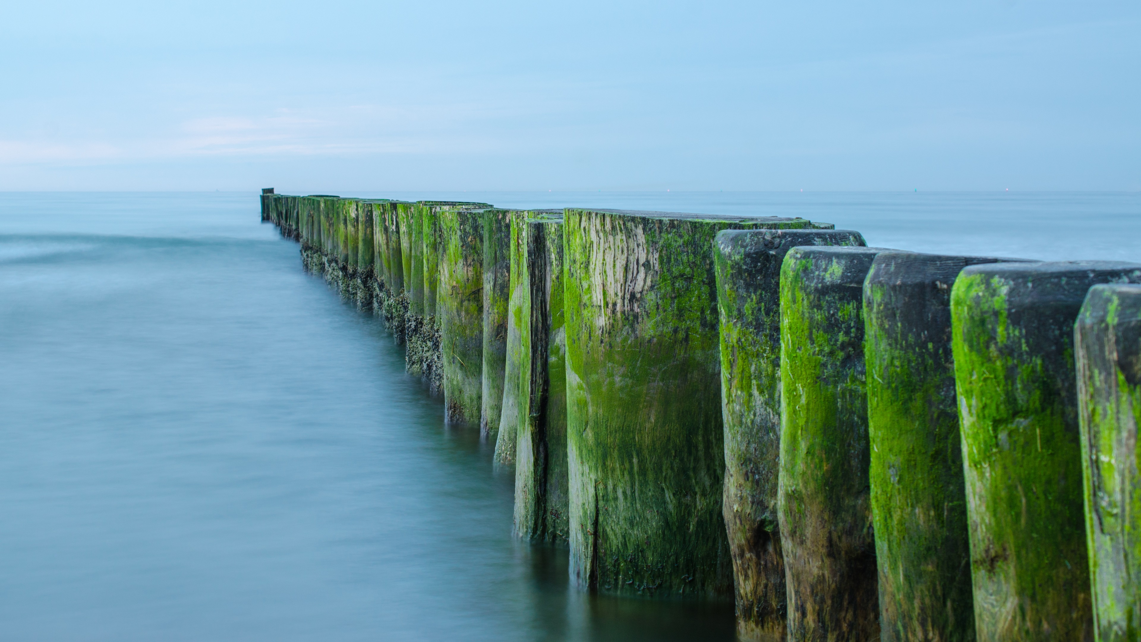 Description: A long wooden pier with a body of water in the background and a blue sky in the background with a few clouds.