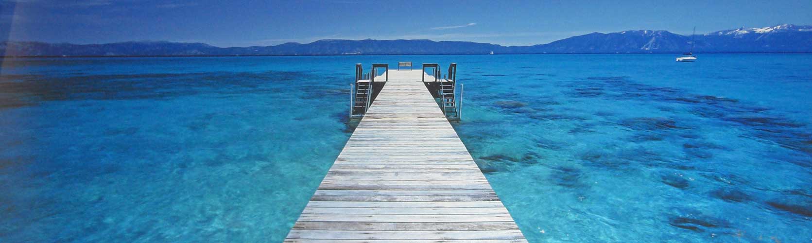 Description: A pier extending into the ocean with a boat in the distance and mountains in the distance behind it.