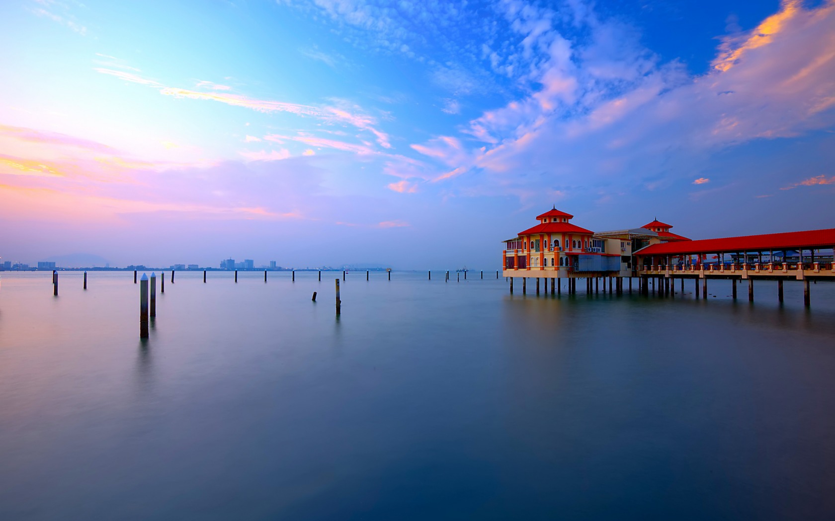 Description: A pier with a red roof and a red building on it's side in the water at sunset.