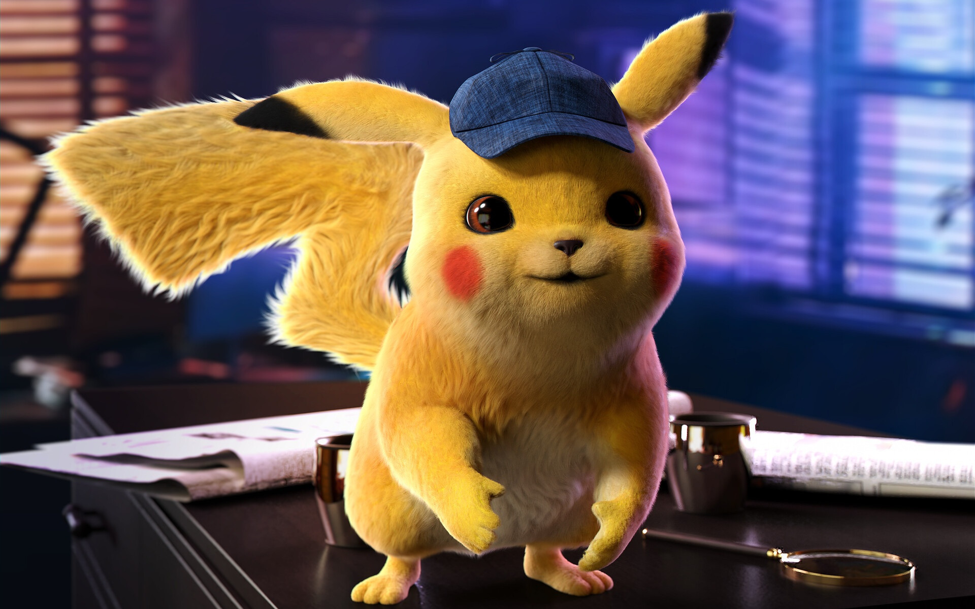 Description: A pikachu is standing on a desk with a book and a pen in front of him and a keyboard in the background.