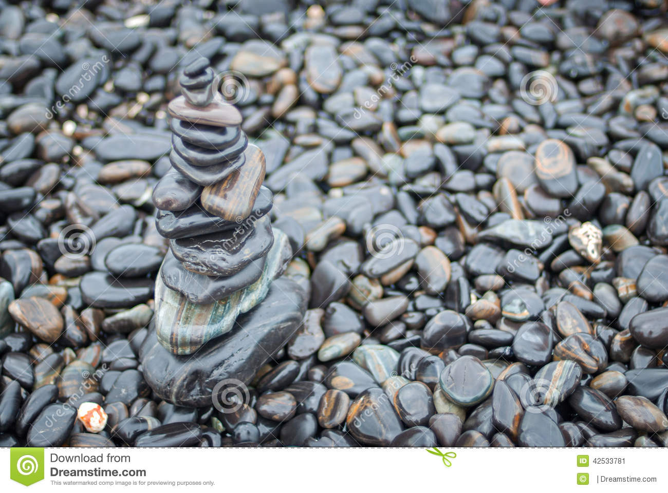 Description: A pile of rocks with a small tower of rocks on top of it.