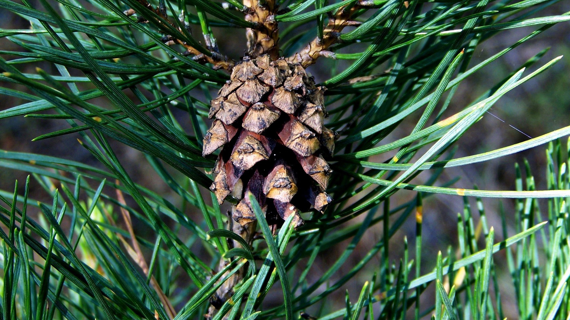 Description: A pine cone is hanging from a pine tree branch with needles and needles on it.