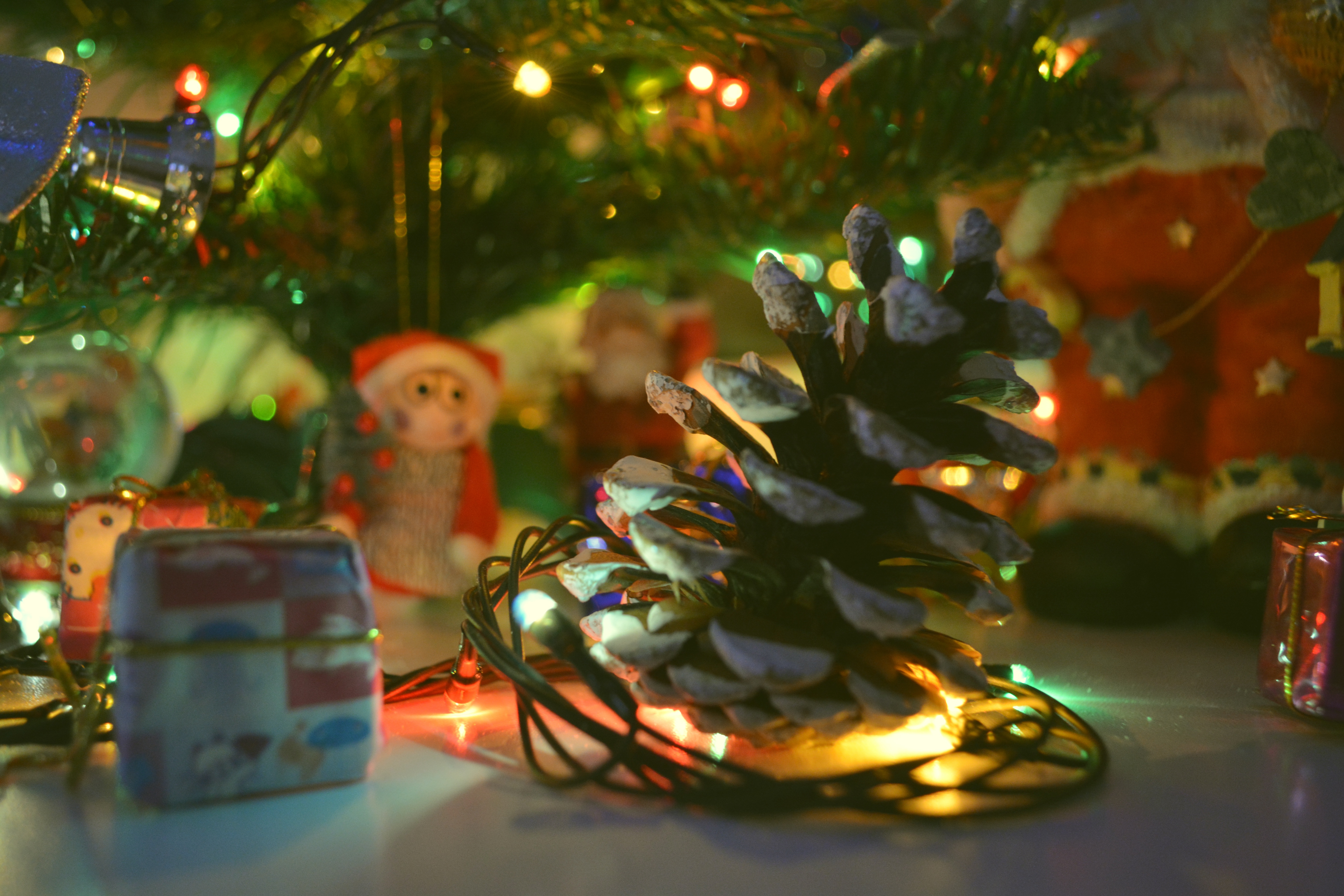 Description: A pine cone is sitting on a table with christmas lights on it and a small box of presents under the tree.