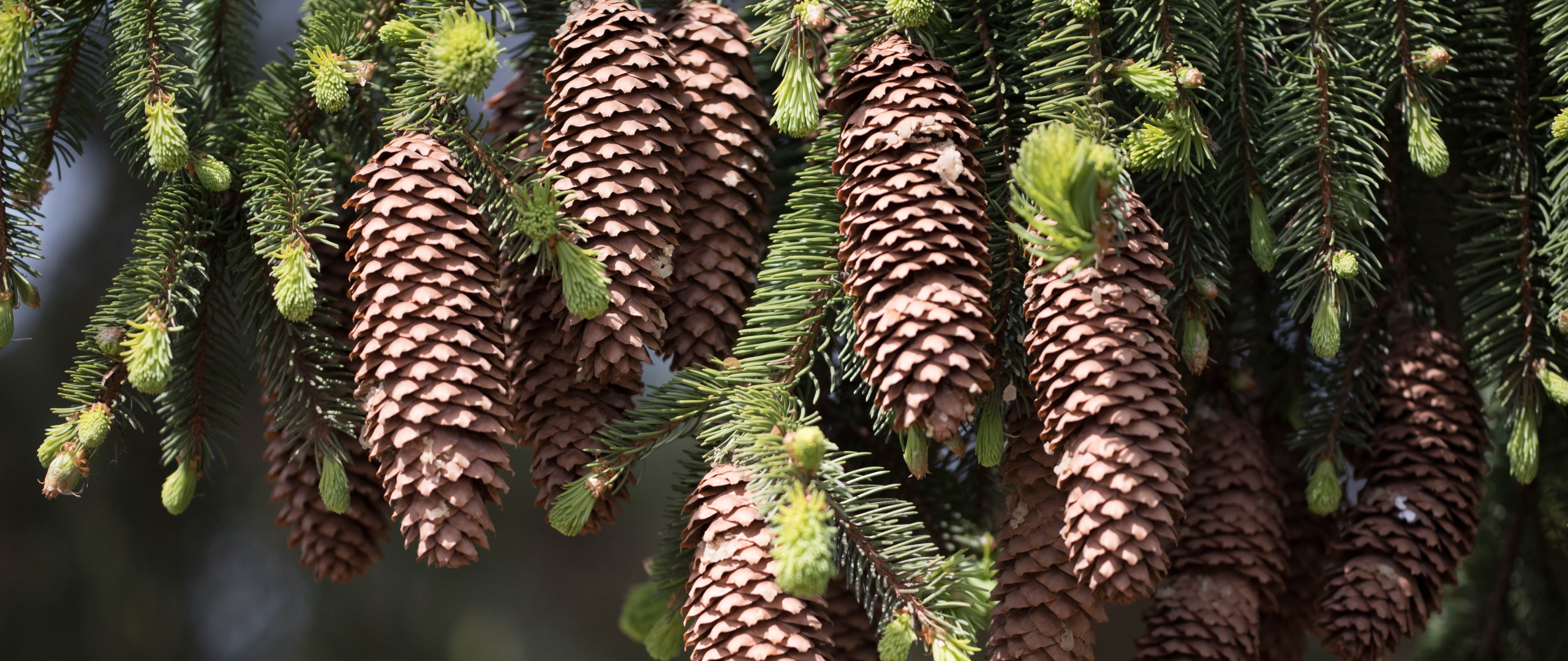 Description: A bunch of pine cones hanging from a tree branch with needles on them.
