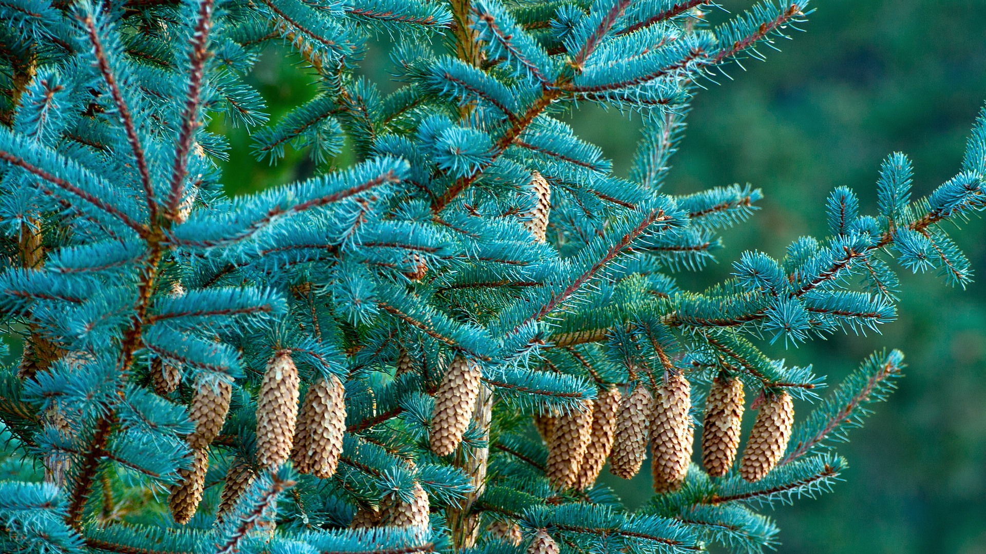 Description: A close up of a pine tree with cones on it's branches and needles on the branches of the tree.