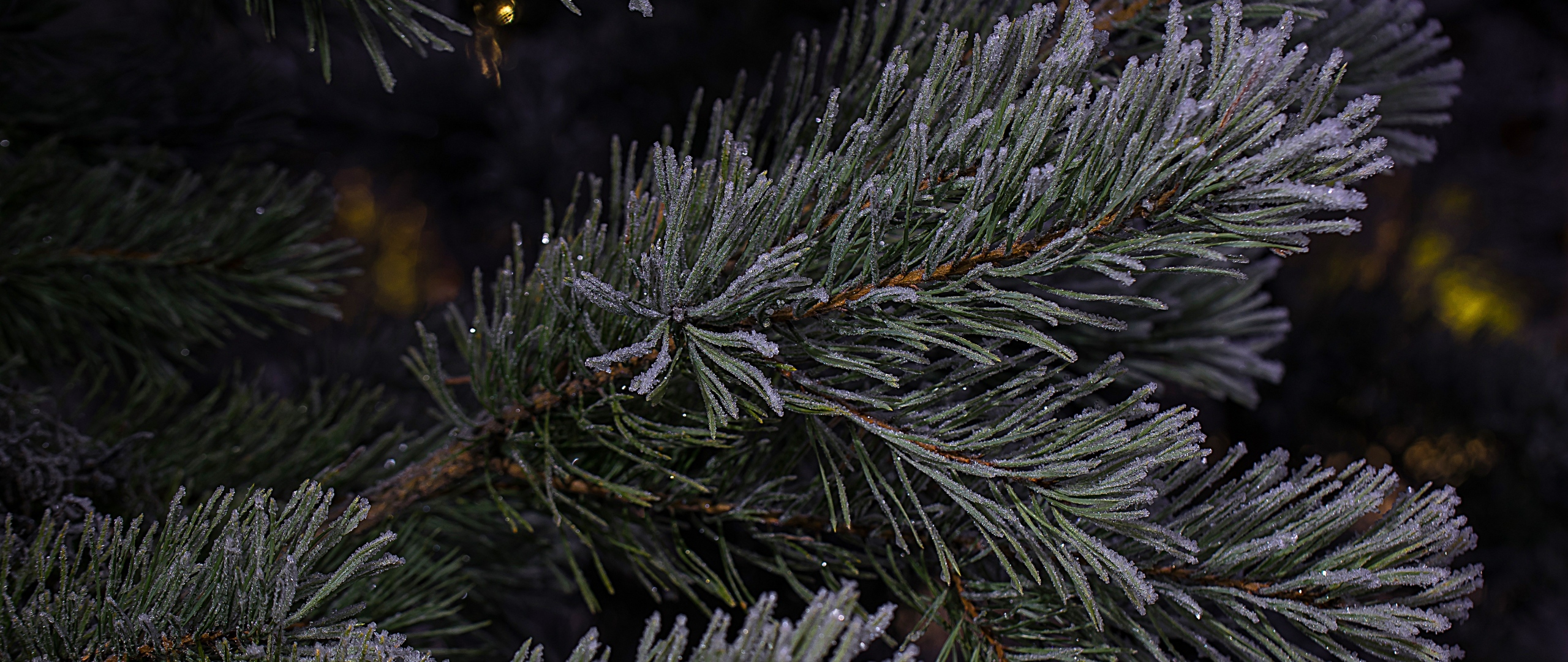 Description: A close up of a pine tree with snow on it's needles and a yellow light in the background.