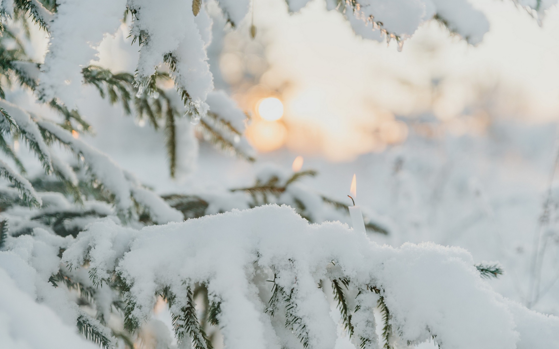 Description: A pine tree covered in snow with the sun in the background and a blurry background of the branches.