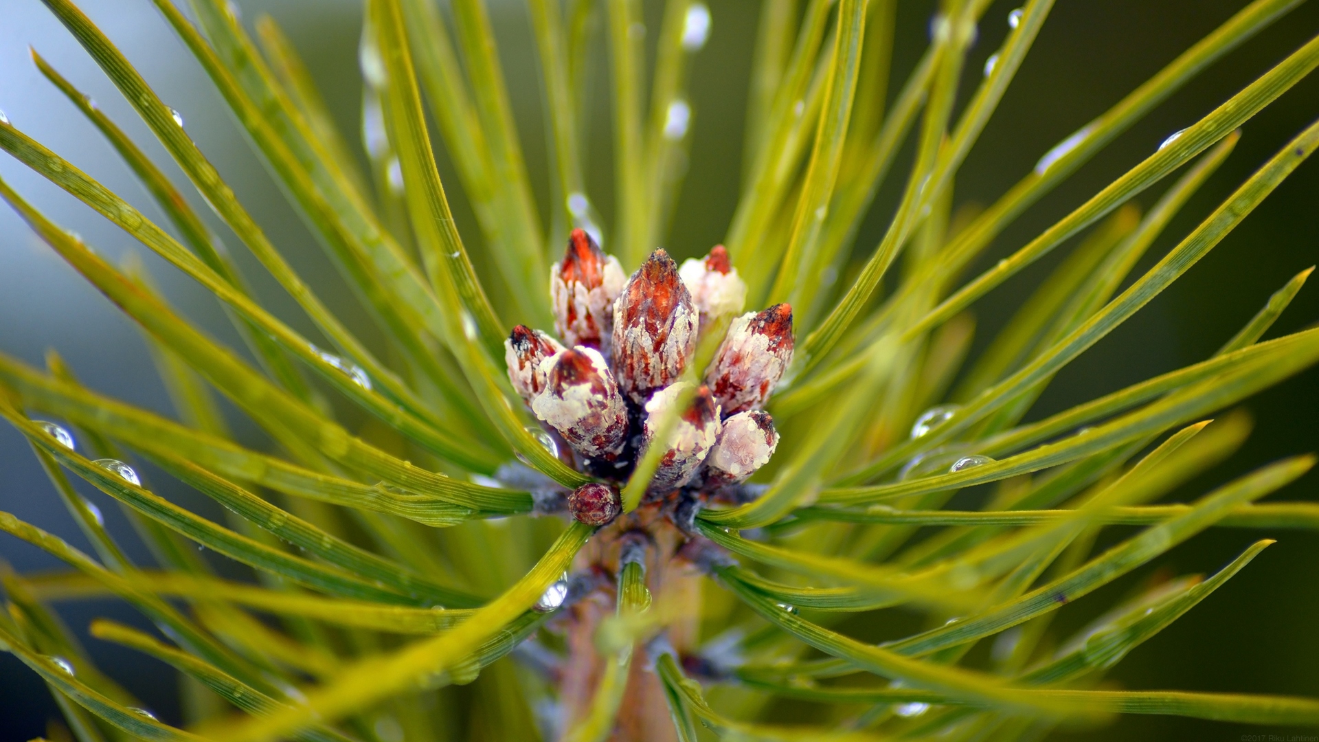 Description: A close up of a pine tree with water droplets on it's leaves and branches.