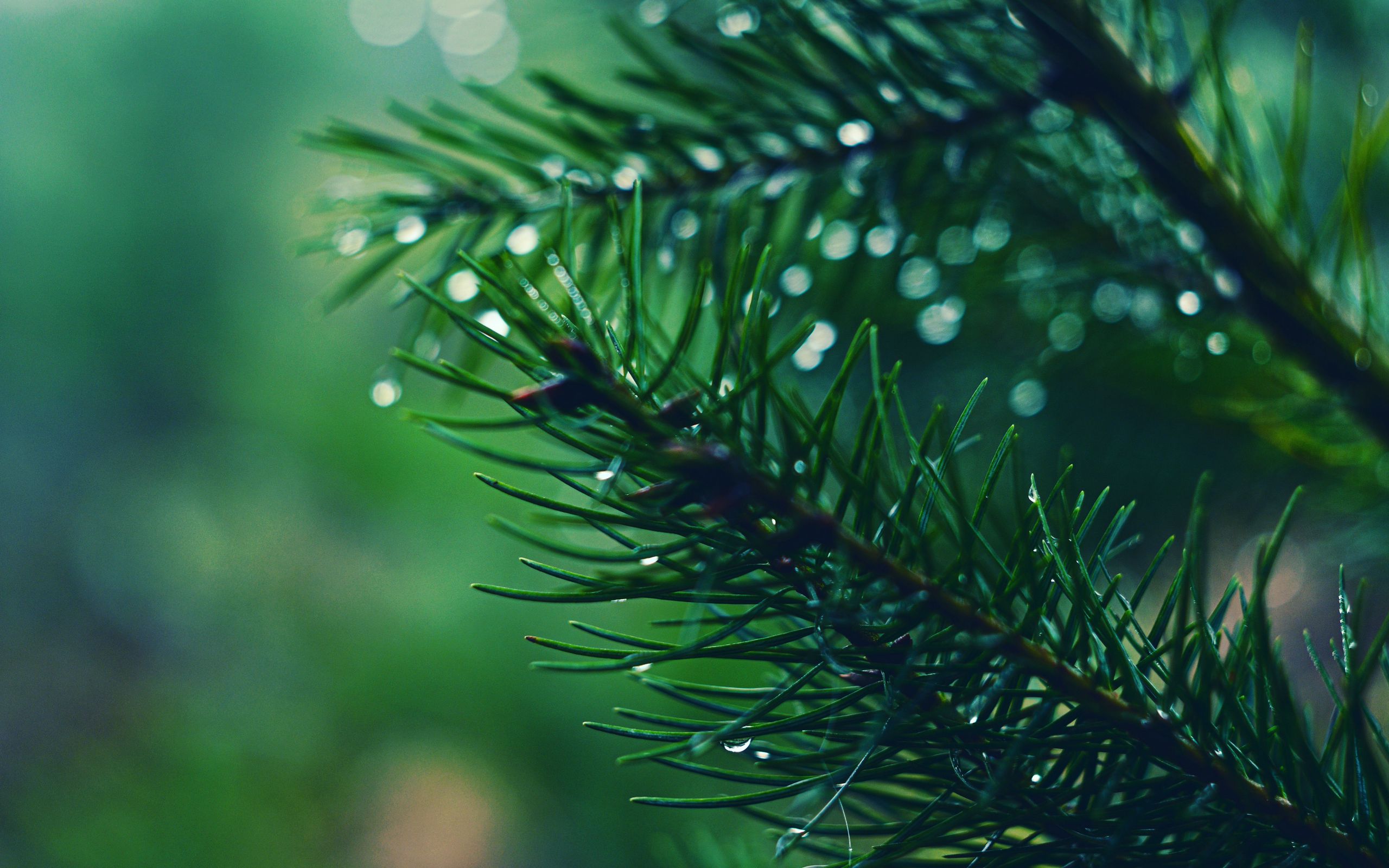 Description: A close up of a pine tree branch with water drops on it's leaves and a blurry background.
