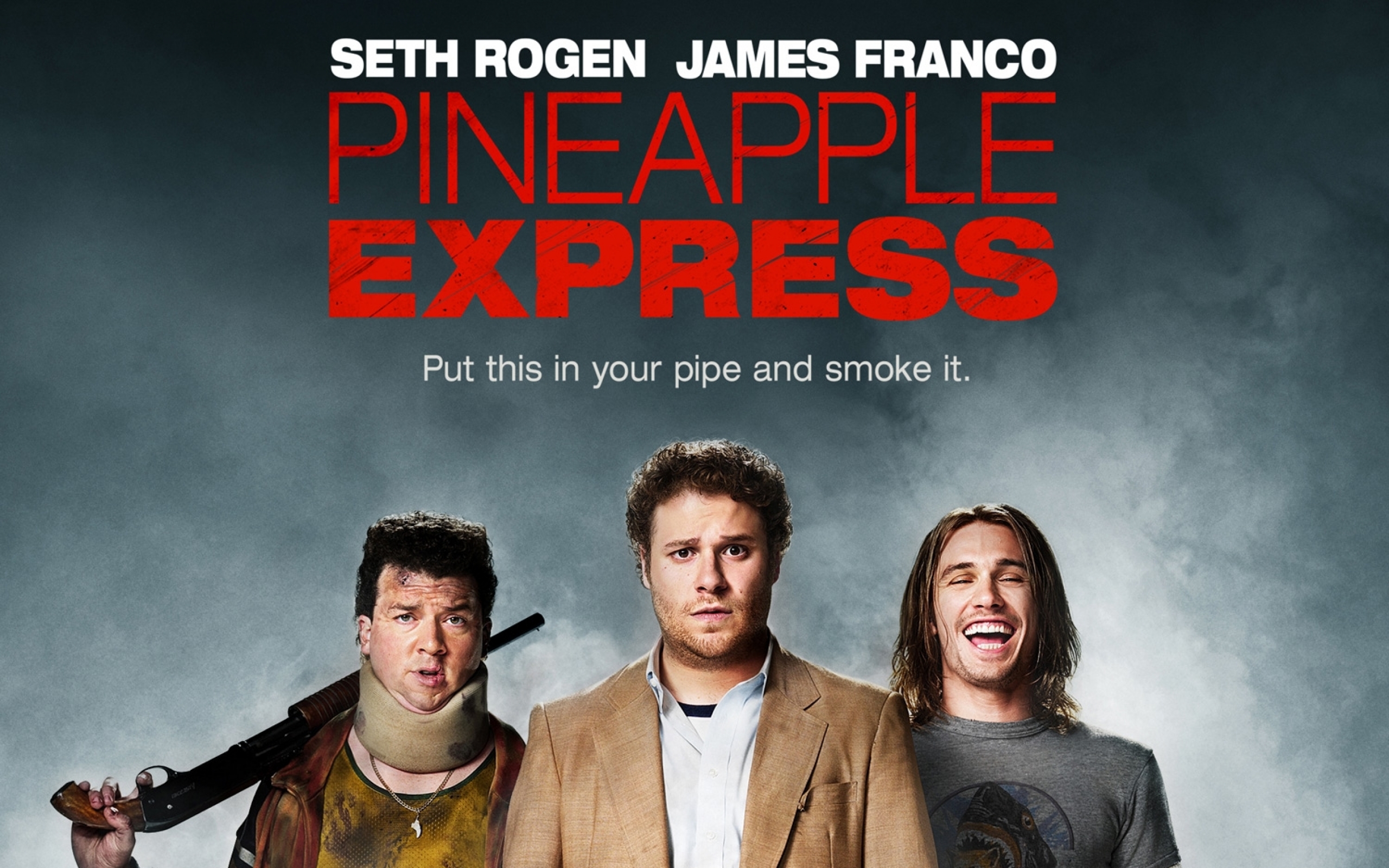 Description: A movie poster for the film pineapple express with three men in front of a dark background and a gun in the air.