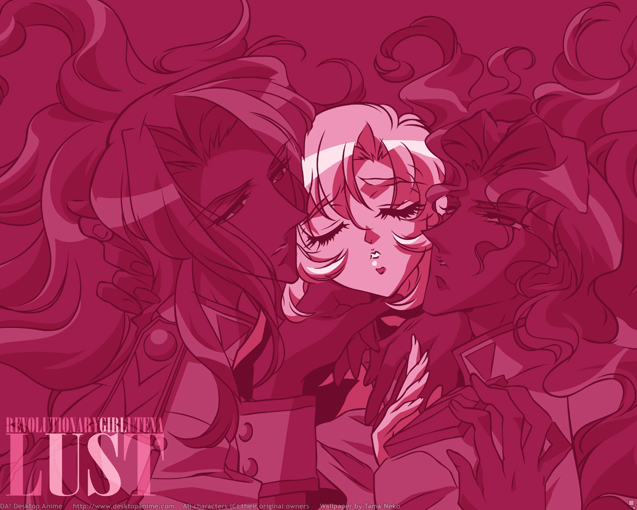 Description: A pink anime girl with long hair and a pink background with the words lust written on it.