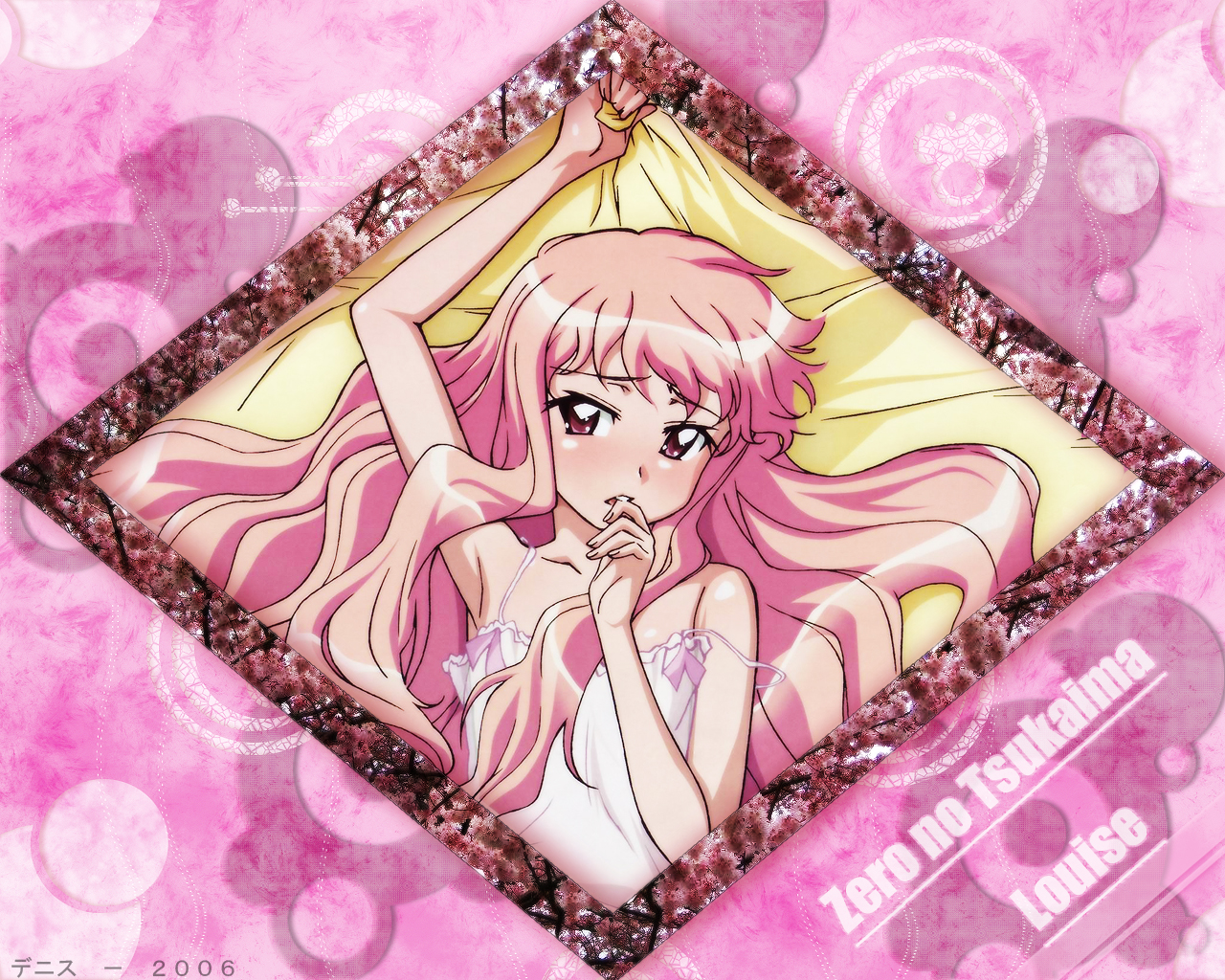 Description: A pink anime girl with long hair and a pink dress on a pink background with bubbles and circles around her.