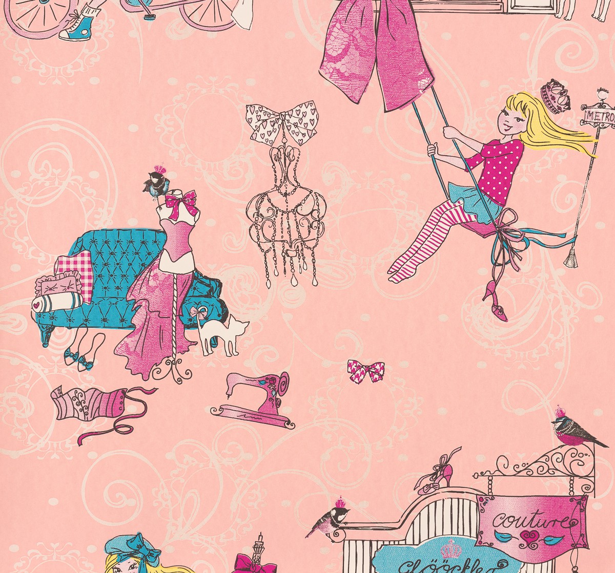 Description: A pink background with a drawing of a girl on a swing and a horse drawn carriage and a dog.