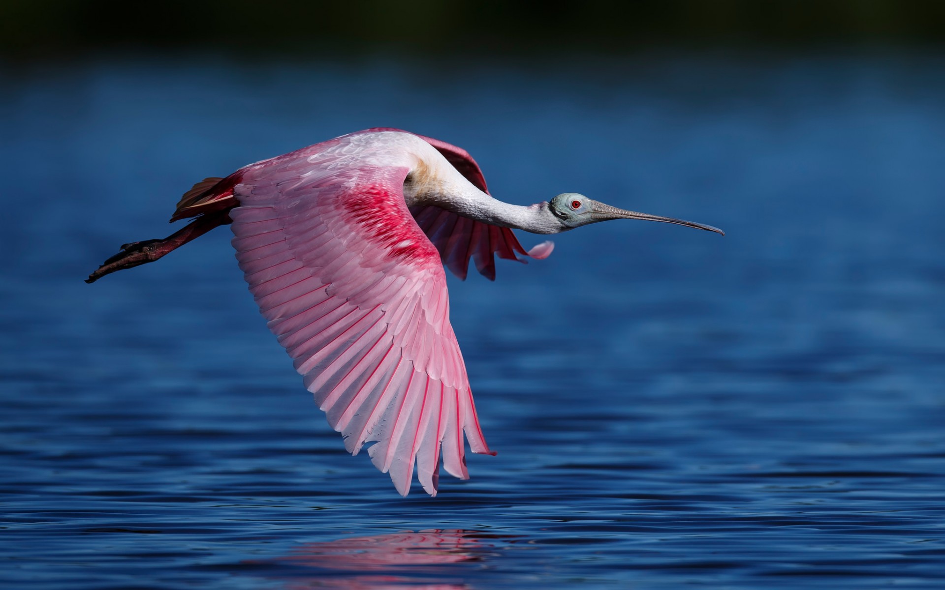 Description: A pink bird flying over a body of water with its wings spread out and it's head above the water.
