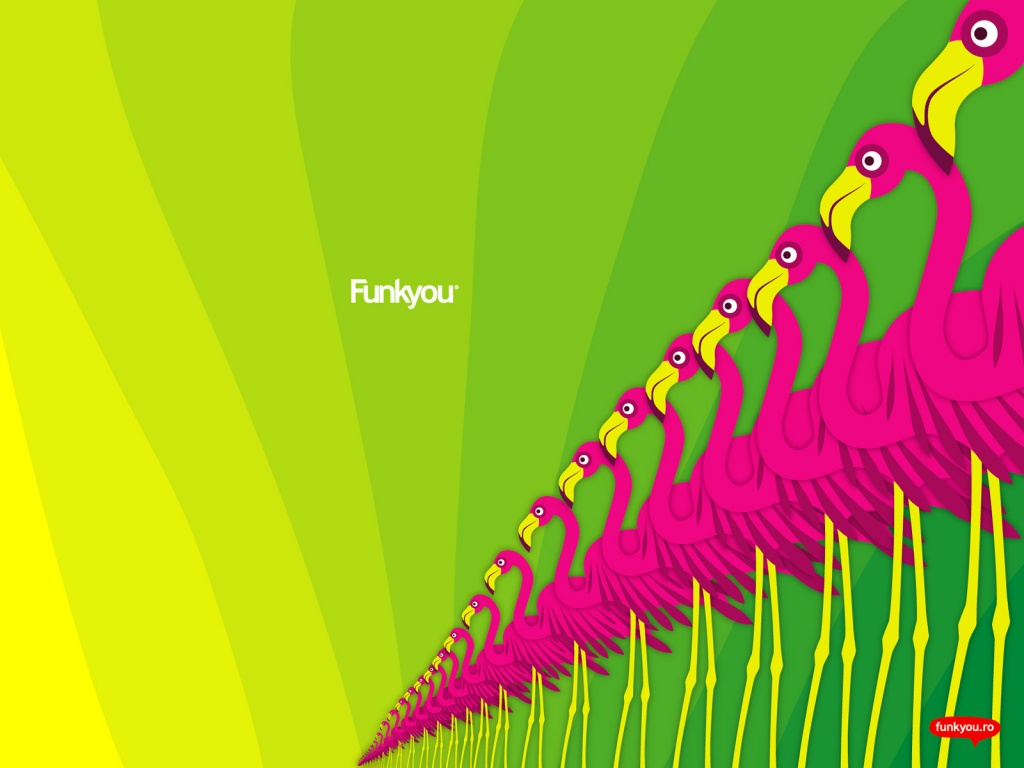 Description: A group of pink birds standing in a row on a green background with a yellow and pink background and a green and yellow background.