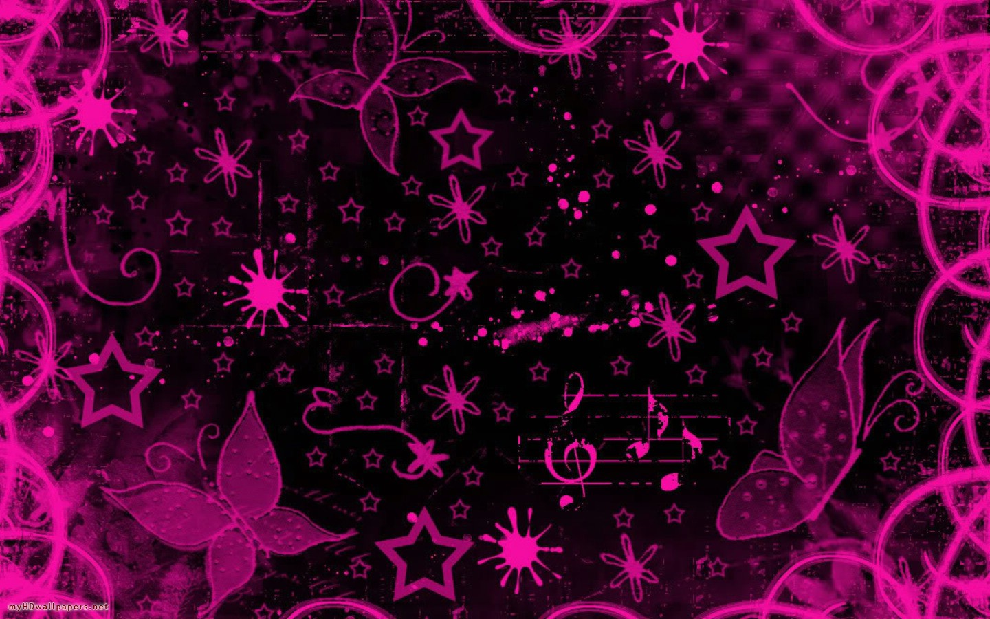 Description: A pink and black background with stars and circles and a butterfly on it's side.