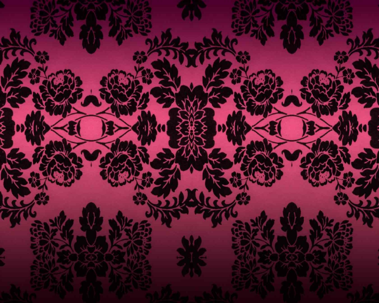Description: A pink and black wallpaper with a floral design on it's side and a black and white stripe.