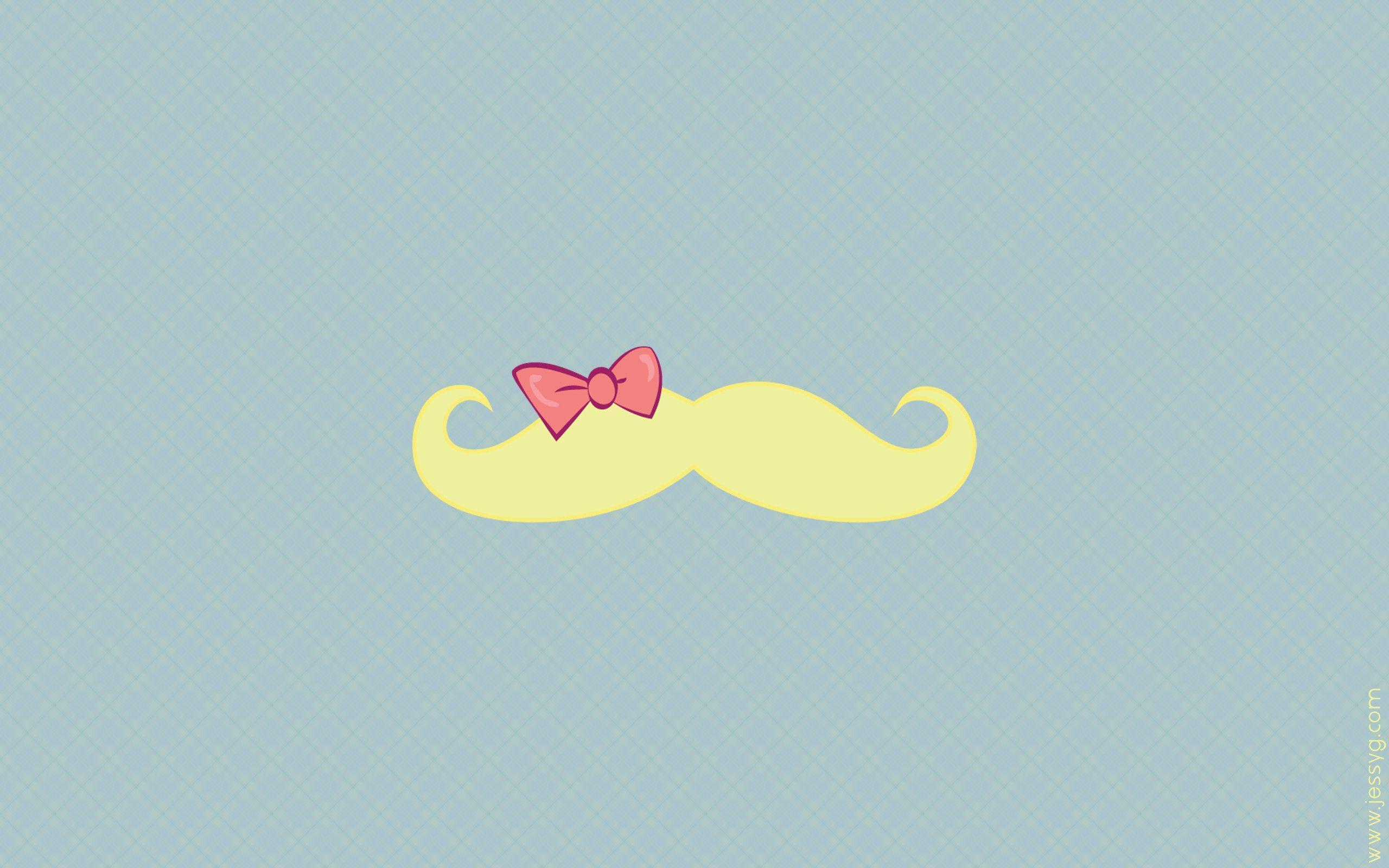 Description: A pink bow tie on a yellow mustache on a blue background with a diagonal pattern of squares and squares.