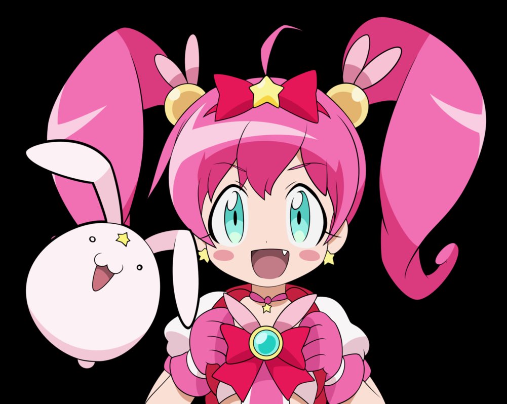 Description: A cartoon character with pink hair and a bunny ears on her head and a pink dress with a gold star on her chest.