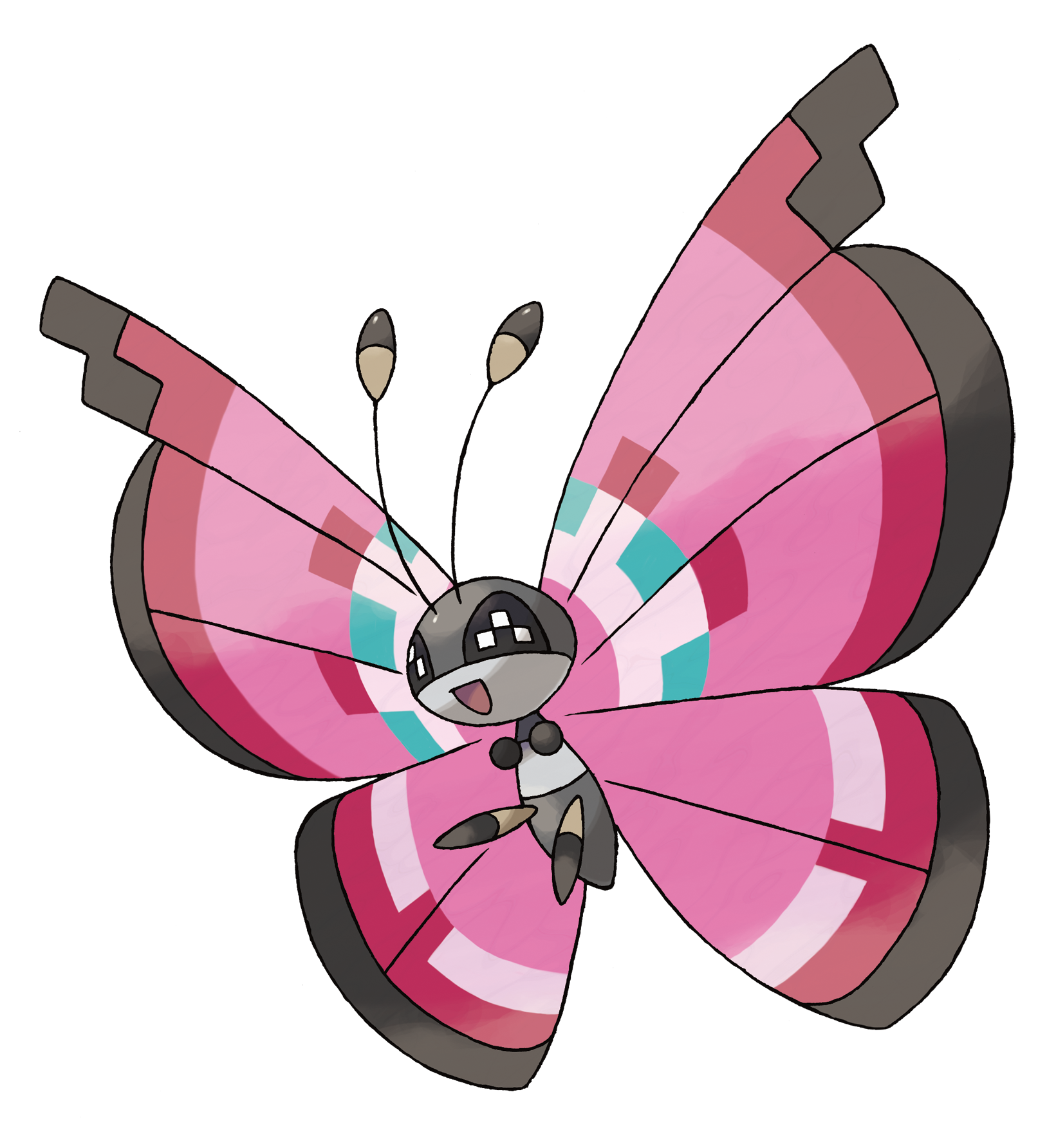 Description: A pink butterfly with a black and white face and a black and white tail and a black and white face.