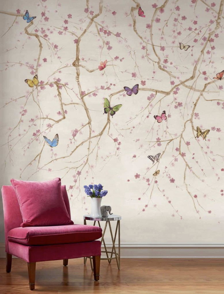 Description: A pink chair sitting in front of a wall with butterflies on it and a vase of flowers on the side.