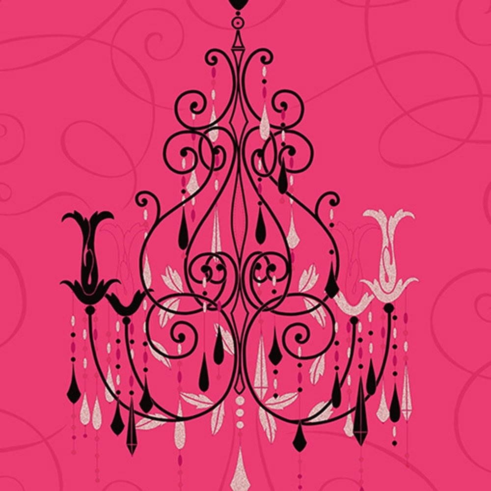 Description: A pink chandelier with black and white designs on it and a pink background with a black and white bird.