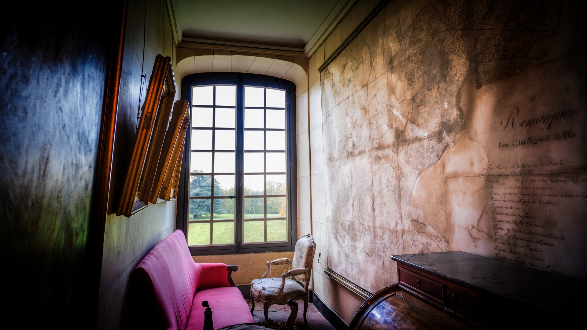 Description: A room with a window and a pink couch in it and writing on the wall behind it and a table with a chair.