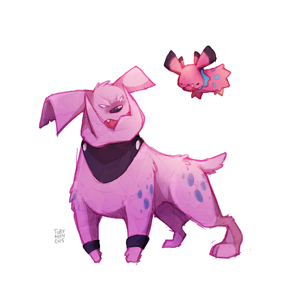 Description: A pink dog with a black collar and a pink bird flying above it's head and a pink object in the air.
