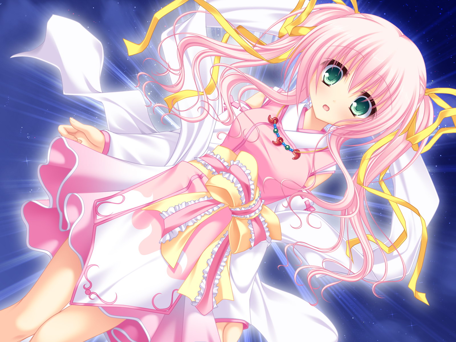 Description: A girl in a pink dress with a white dress and yellow hair and a necklace on her neck and a blue background.