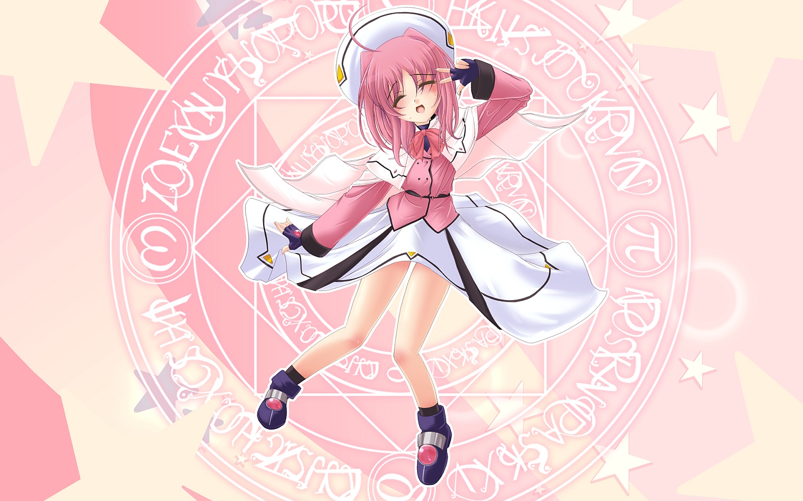 Description: A girl in a pink dress and hat with a pink background and stars around her is holding a pink umbrella.