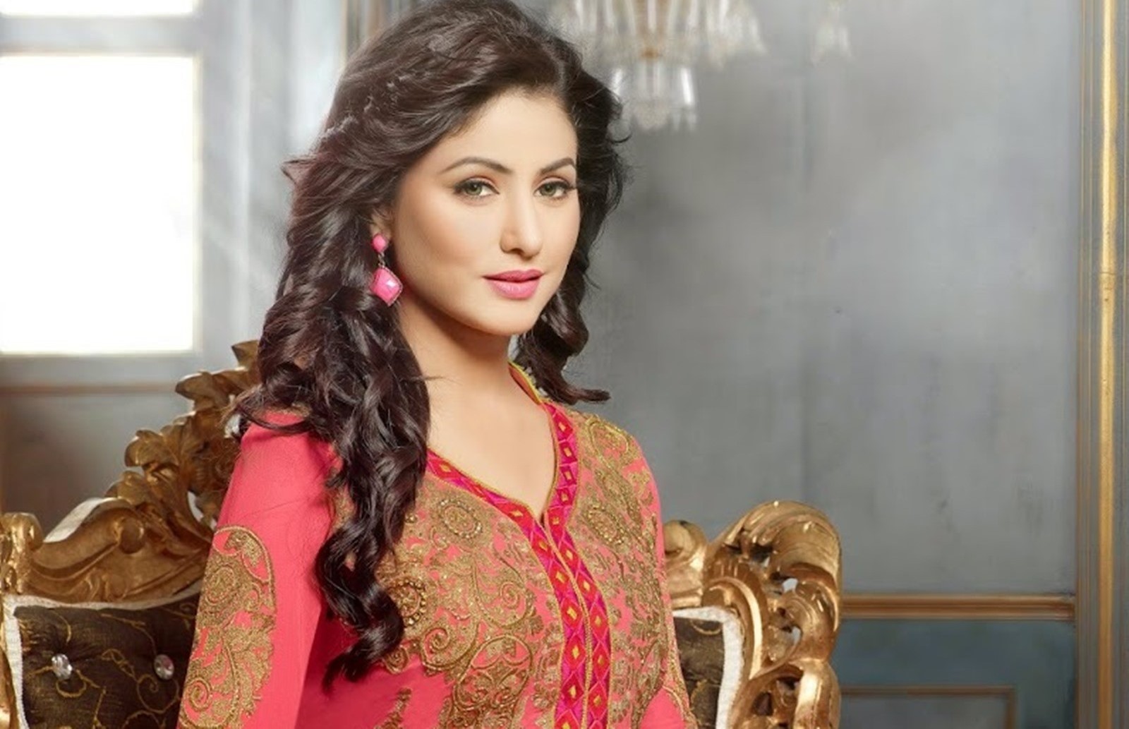 Description: A woman in a pink dress sitting on a gold chair with a chandelier hanging from the ceiling.
