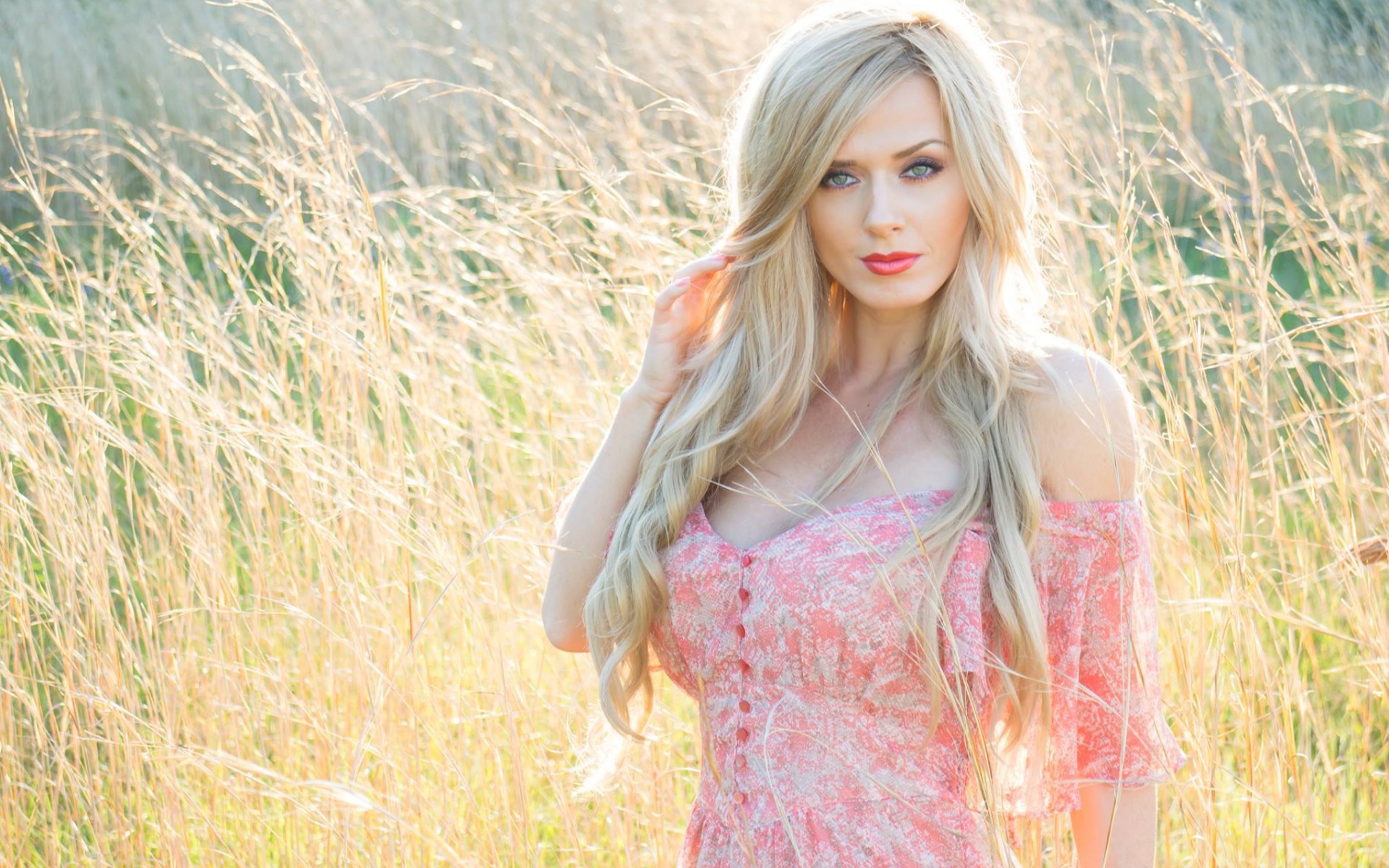 Description: A woman in a pink dress standing in a field of tall grass with her hair in the wind and her eyes closed.