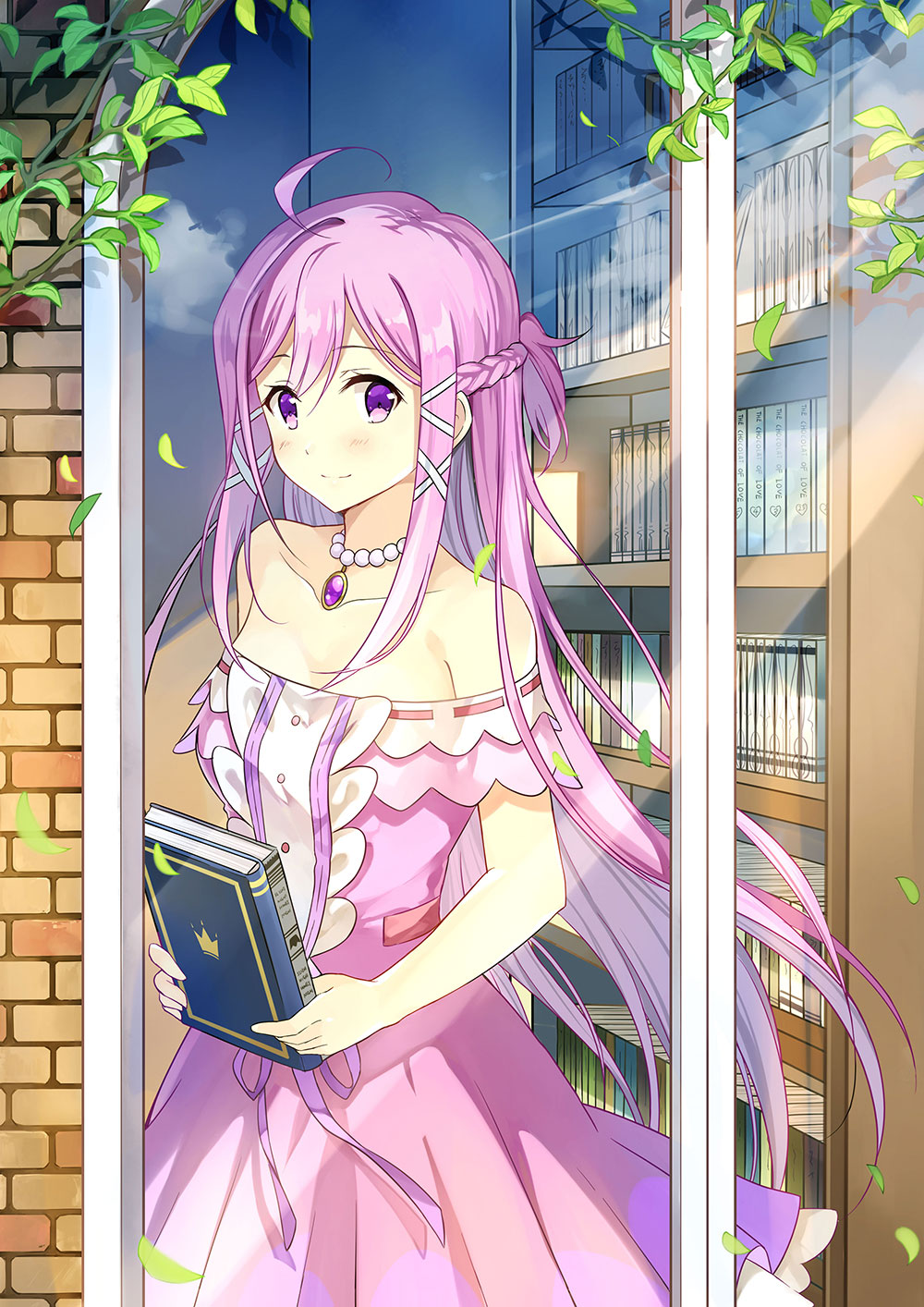 Description: A woman in a pink dress holding a book in her hand and looking out a window with a brick wall.