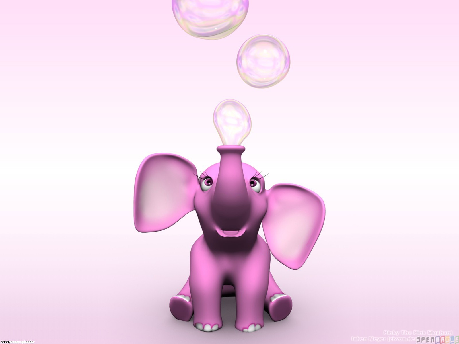 Description: A pink elephant with bubbles floating from its trunk and head to its trunk.