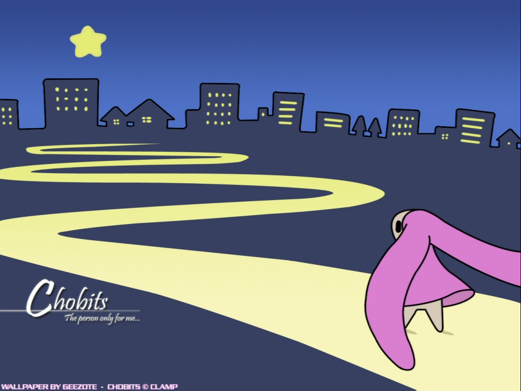 Description: A cartoon of a pink elephant walking down a street at night with a city in the background and a star above.