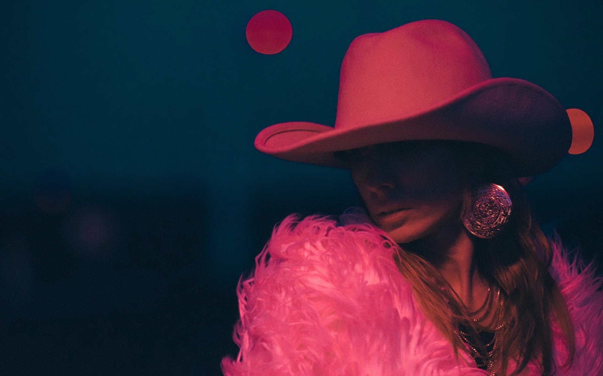 Description: A woman wearing a pink hat and feather coat with a pink feather coat on her shoulders and a pink feather coat on her shoulder.
