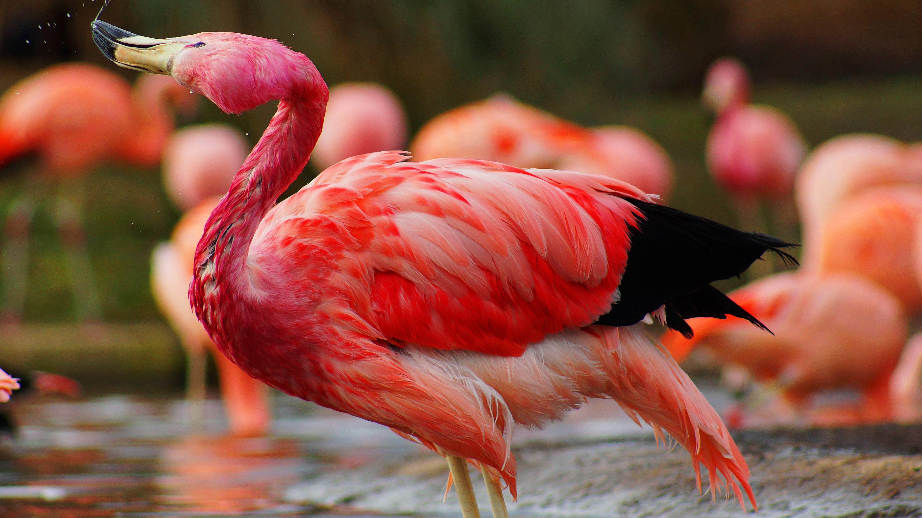 Description: A pink flamingo standing in a body of water with other flamingos in the background and one flamingo looking at the camera.