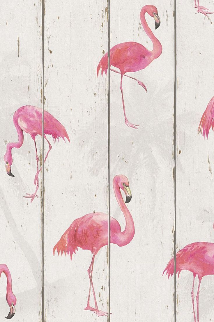 Description: A group of pink flamingos standing on top of a wooden fence next to each other on a white background.