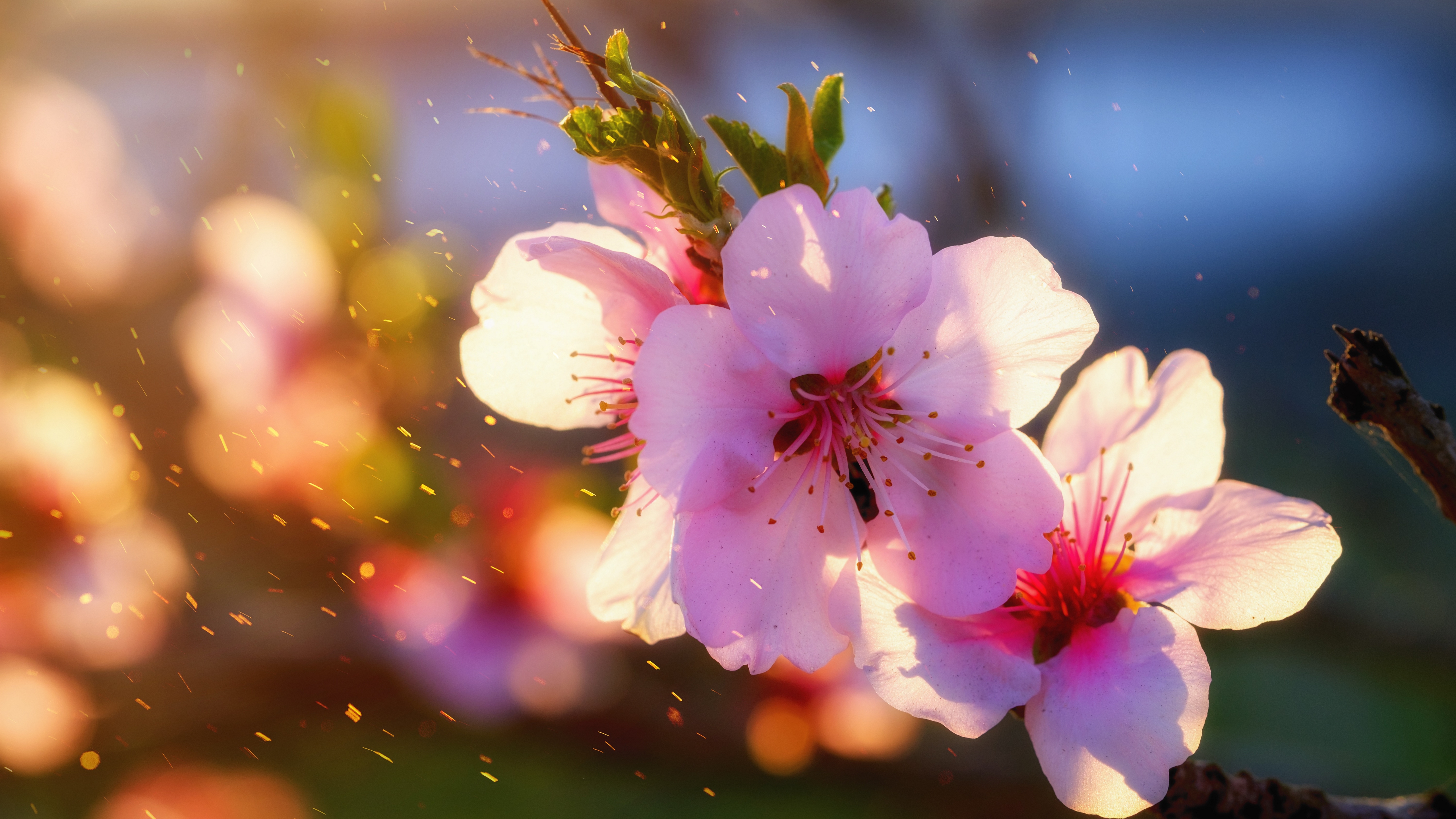 Description: A pink flower with a bee on it's back end and a blurry background behind it.