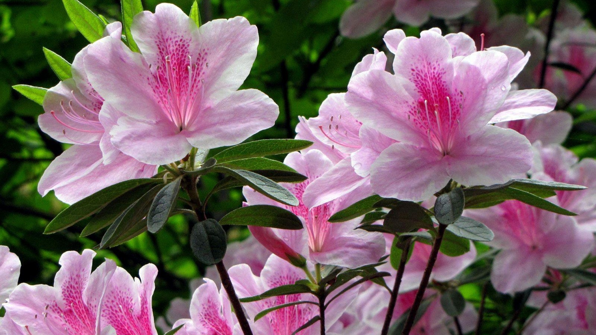 Description: A bunch of pink flowers with green leaves in the background and a blurry background behind them.